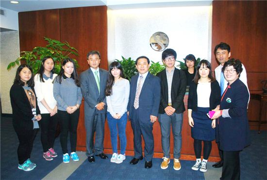 미국 뉴욕에 위치한 신한은행 아메리카 본점에서 인턴십에 참가한 특성화고 학생들과 박우혁 법인장(왼쪽에서 네 번째)이 기념촬영을 하고 있다.
