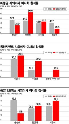 [아시아경제 박민규 기자] 동양그룹 주요 계열사의 사외이사 대부분은 이사회에 거의 참석하지도 않고 보수만 챙겨온 것으로 나타났다. 이사회 안건에 반대한 경우도 전혀 없어 거수기 역할을 해왔다. 특히 법조계 인사가 다수 포진돼 있어 검사 출신인 현재현 동양그룹 회장의 인맥을 통한 구색 맞추기라는 지적이 나온다.21일 금융감독원 전자공시에 따르면 지난 17일 법원에서 기업회생절차(법정관리) 개시가 결정 난 ㈜동양·동양시멘트·동양네트웍스의 사외이사들은 대부분 이사회 참석률이 50%가 채 안되는 것으로 확인됐다.㈜동양의 사외이사로 있는 한태규 전 주태국 대사와 이원창 전 감사원 감사위원, 송태호 카이스트 기계공학과 교수의 경우 올 상반기 동안 열린 20번의 이사회 중 참석한 날은 각각 7·10·4번에 그쳤다. 지난해에도 상황은 비슷해 참석률이 40~50%대에 머물렀다. 한부환 전 법무부 차관의 경우 그나마 올 상반기 이사회 참석률이 90%로 높았다. 이들은 이사회에 참석해 모든 안건에 찬성표를 던졌다. 이번 법정관리 사태의 주요 원인 중 하나인 회사채 발행 안건도 마찬가지였다. 지난 4월10일 1000억원 규모 회사채를 발행할 때는 한태규 외 세 명의 사외이사가 참석해 모두 찬성했다. 지난 6월3일 회사채 610억원 발행 안건을 처리할 때는 네 명의 사외이사가 다 참석해 찬성에 손을 들어줬다. 앞서 지난 2월7일 900억원 규모 회사채 발행 등을 위해 열린 이사회에는 한부환 사외이사만 홀로 참석해 찬성표를 던졌지만 안건은 무난히 가결됐다. 이 회사의 사내이사 수는 사외이사보다 두 배 이상 많은 10명이다. 사외이사들이 모두 불참해도 안건 처리가 가능한 것이다. 사외이사들이 반대표를 던진다고 해도 사내이사들이 모두 찬성하면 안건이 무사통과될 수밖에 없는 구조다.이들이 받은 보수는 ㈜동양 직원들의 평균 급여보다 많았다. ㈜동양 사외이사들의 1인당 평균 보수는 올 상반기 2400만원, 지난해 4800만원이었다. 이 회사 직원 평균 급여가 올 상반기 2400만원, 지난해 4500만원인 점을 감안하면 딱히 하는 일도 없이 직원들보다 많은 돈을 챙긴 셈이다.동양시멘트 사외이사들도 이사회 참석률이 극히 저조했다. 이경재 전 대구지검 제1차장검사와 박균관 전 한영회계법인 대표, 공봉성 한국광물자원공사 자원기반본부장의 이사회 참석률은 올 상반기 각각 36.4%, 27.3%, 12.5%에 불과했다. 지난해에는 이보다 더 낮았다. 이들 역시 참석한 이사회의 모든 안건에 찬성했다. 지난 3월26일 700억원 규모 회사채 발행을 위해 열린 이사회에서 이경재·박균관 사외이사는 모두 찬성표를 던졌고 공봉성 사외이사는 불참했다. 지난 6월11일 열린 이사회에서 800억원 규모 회사채 발행 안건을 처리할 때는 사외이사 세 명이 모두 불참했지만 안건은 가결됐다. 동양시멘트 역시 ㈜동양과 마찬가지로 사내이사 수가 사외이사보다 두 배 이상 많은 8명이다. 사외이사들의 찬반 여부는 대세에 지장을 주지 못하는 것이다.동양시멘트는 사외이사들에게 올 상반기 1인당 평균 1600만원, 지난해 4400만원을 지급했다. 동양네트웍스의 경우 송상호 경희대 경영대학원 교수와 김상래 전 한국전자인증 부사장, 박무석 전 서초세무서장이 사외이사로 있다. 이들은 올 상반기 열린 19번의 동양네트웍스 이사회 중 각각 3·6·8번만 참석했다. 참석률이 10~40%대에 그친 것이다. 지난해에도 상황은 비슷했다. 이들이 이사회 안건에 반대를 던진 경우는 한 번도 없었다.동양네트웍스 사외이사들은 올 상반기 1인당 평균 1200만원, 지난해 2100만원의 보수를 받았다. 동양그룹 법정관리 계열사의 기업어음(CP)과 회사채를 대거 개인투자자들에게 팔아 치운 동양증권의 경우 5명의 사외이사 중 4명이 법조인 출신이었다. 금융회사의 사외이사를 맡기에는 부적합하다는 지적이다. 강기정 민주당 의원은 지난 17일 열린 국회 정무위원회 국정감사에서 "㈜동양을 비롯해 동양시멘트·동양증권 등 9개 계열사가 지금까지 정권의 측근이나 감독기관 출신 고위 인사들을 임원과 사외이사·고문 등으로 집중 영입해왔다"며 "동양그룹 9개 계열사에 영입된 유력 인사만 41명에 달한다"고 말했다. 강 의원에 따르면 이명박 경선 후보 법률지원단장과 대통령 인수위원을 거쳐 18대 총선에서 부산 동래 새누리당 공천을 받았던 오세경 변호사가 ㈜동양 클린경영팀장으로 영입됐다. 또한 최연희 전 의원이 동양파워 대표이사로, 조동성 전 새누리당 비대위원과 이달곤 전 행정안전부 장관은 사외이사로 각각 영입됐다. 강 의원은 "동양그룹은 유력 인사 놀이터나 마찬가지였다"며 "영입된 인사들이 동양그룹 거수기로 전락하거나 로비 통로로 활용됐을 가능성이 매우 크다"고 지적했다.박민규 기자 yushin@asiae.co.kr<ⓒ세계를 보는 창 경제를 보는 눈, 아시아경제(www.asiae.co.kr) 무단전재 배포금지>