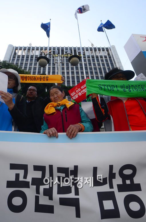 [아시아경제 백소아 기자] 22일 서울 서대문구 경찰청에서 열린 '경찰의 폭력적 공권력 남용에 대한 항의' 기자회견에서 밀양 주민이 밀양 송전탑 반대가 적힌 손팻말을 들고 있다. 밀양 주민들은 25일까지 매일 대한문 앞에서 릴레이 756배와 촛불문화제를 열 계획이다.백소아 기자 sharp2046@asiae.co.kr<ⓒ세계를 보는 창 경제를 보는 눈, 아시아경제(www.asiae.co.kr) 무단전재 배포금지>