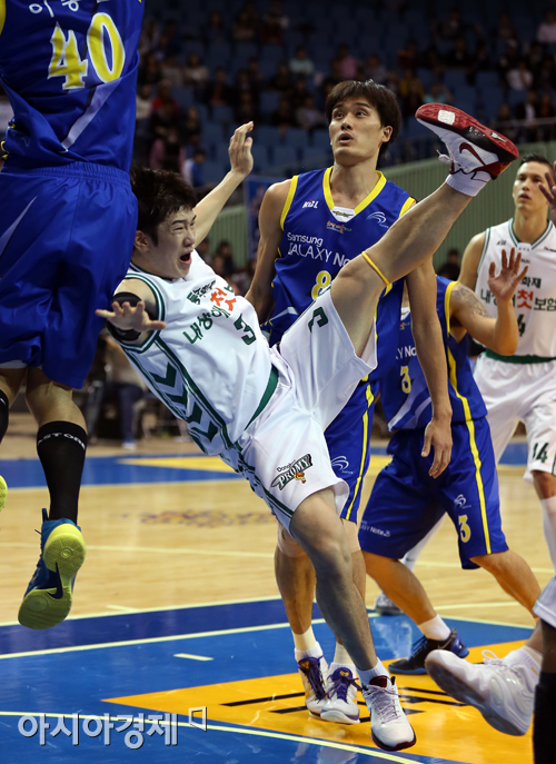 [아시아경제 정재훈 기자] 22일 오후 서울 잠실실내체육관에서 열린 2013-2014 KB국민카드 프로농구 서울 삼성 썬더스와 원주 동부 푸르미의 경기. 동부 박병우가 슛 도중 중심을 잃고 넘어지고 있다.정재훈 기자 roze@asiae.co.kr<ⓒ세계를 보는 창 경제를 보는 눈, 아시아경제(www.asiae.co.kr) 무단전재 배포금지>