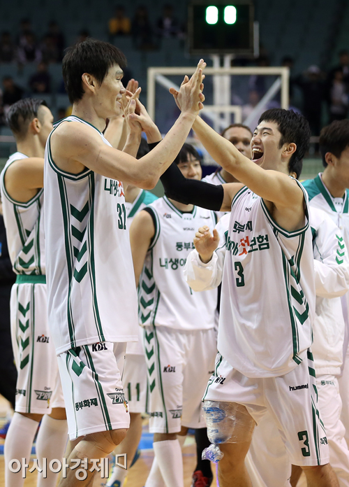 [아시아경제 정재훈 기자] 원주 동부 푸르미가 22일 오후 서울 잠실실내체육관에서 열린 2013-2014 KB국민카드 프로농구 서울 삼성 썬더스와의 경기에서 85:84 역전승을 거뒀다.정재훈 기자 roze@asiae.co.kr<ⓒ세계를 보는 창 경제를 보는 눈, 아시아경제(www.asiae.co.kr) 무단전재 배포금지>