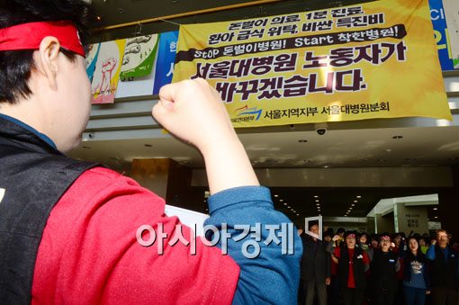 [아시아경제 백소아 기자] 서울대병원 노조가 6년 만에 총파업에 돌입한 23일 서울 종로구 서울대병원 본관에서 열린 총파업 출정식에서 노조원들이 임을 향한 행진곡을 부르고 있다. 노조는 "응급실과 중환자실 등에 최소 필수 인원만 배치한 채 조합원 350~400여 명이 전면파업에 돌입한다"고 밝혔다.백소아 기자 sharp2046@asiae.co.kr<ⓒ세계를 보는 창 경제를 보는 눈, 아시아경제(www.asiae.co.kr) 무단전재 배포금지>