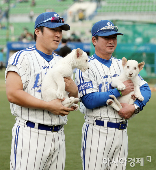 [대구=아시아경제 정재훈 기자] 24일 오후 대구시민야구장에서 '2013 한국야쿠르트 세븐 프로야구' 삼성 라이온즈와 두산 베어스의 한국 시리즈 1차전에 앞서 삼성 최형우와 류중일 감독이 백사자를 품에 안고 포즈를 취하고 있다.정재훈 기자 roze@asiae.co.kr<ⓒ세계를 보는 창 경제를 보는 눈, 아시아경제(www.asiae.co.kr) 무단전재 배포금지>