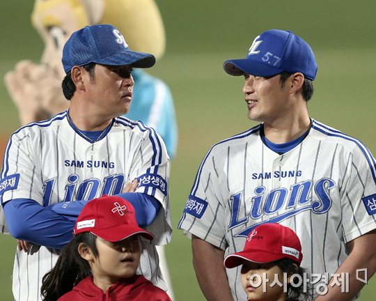 [대구=아시아경제 정재훈 기자] 24일 오후 대구시민야구장에서 열린 '2013 한국야쿠르트 세븐 프로야구' 삼성 라이온즈와 두산 베어스의 한국 시리즈 1차전. 삼성 진갑용과 오승환이 대화를 나누고 있다.정재훈 기자 roze@asiae.co.kr<ⓒ세계를 보는 창 경제를 보는 눈, 아시아경제(www.asiae.co.kr) 무단전재 배포금지>
