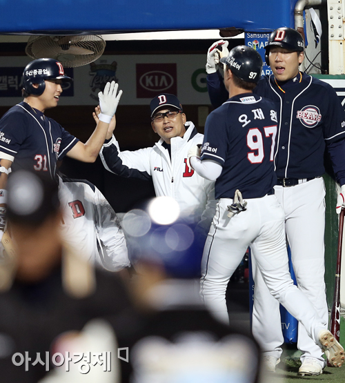 [대구=아시아경제 정재훈 기자] 24일 오후 대구시민야구장에서 열린 '2013 한국야쿠르트 세븐 프로야구' 삼성 라이온즈와 두산 베어스의 한국 시리즈 1차전. 2회초 2사 1, 3루 상황 손시헌의 1타점 적시타에 3루주자 오재원이 홈인하고 있다.정재훈 기자 roze@asiae.co.kr<ⓒ세계를 보는 창 경제를 보는 눈, 아시아경제(www.asiae.co.kr) 무단전재 배포금지>