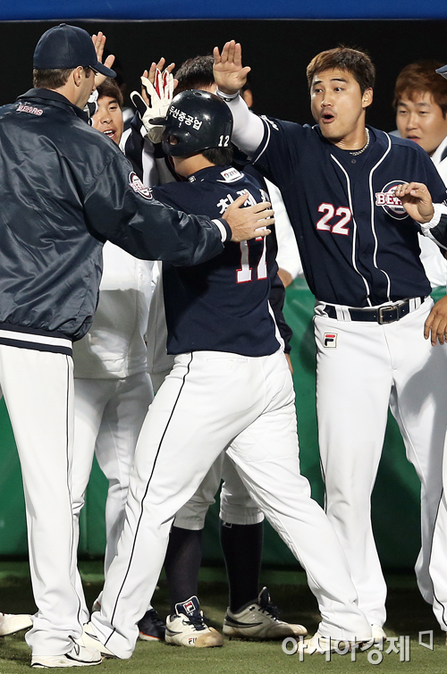 [대구=아시아경제 정재훈 기자] 24일 오후 대구시민야구장에서 열린 '2013 한국야쿠르트 세븐 프로야구' 삼성 라이온즈와 두산 베어스의 한국 시리즈 1차전. 2회초 2사 1, 2루 상황 이종욱의 1타점 적시타에 2루주자 최재훈이 홈인하고 있다.정재훈 기자 roze@asiae.co.kr<ⓒ세계를 보는 창 경제를 보는 눈, 아시아경제(www.asiae.co.kr) 무단전재 배포금지>