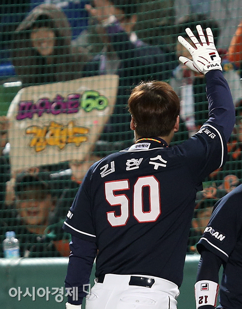 [대구=아시아경제 정재훈 기자] 24일 오후 대구시민야구장에서 열린 '2013 한국야쿠르트 세븐 프로야구' 삼성 라이온즈와 두산 베어스의 한국 시리즈 1차전. 5회초 1사 무주자 상황 김현수가 우익수 뒤 솔로홈런을 치고 관중석을 향해 손을 흔들고 있다.정재훈 기자 roze@asiae.co.kr<ⓒ세계를 보는 창 경제를 보는 눈, 아시아경제(www.asiae.co.kr) 무단전재 배포금지>