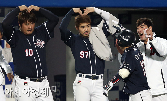 [포토] 최준석-오재원 '손시헌 향한 왕 하트'