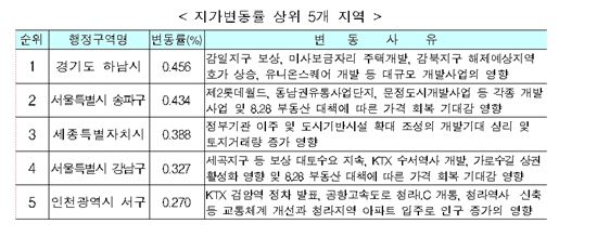 [아시아경제 박소연 기자]국토교통부는 9월 전국 땅값이 8월 대비 0.08% 상승하며 안정세를 보이고 있다고 25일 밝혔다. 금융위기 발생 전 고점 보다 0.56% 높은 수준이다.권역별로는 수도권(0.09%)이 지방권(0.06%)에 비해 상대적으로 높은 상승률을 보였다.여름철 비수기, 취득세 감면 종료 등의 영향으로 2개월 연속 하락했던 서울시는 9월들어 전월대비 0.15% 상승했다. 송파구(0.43%), 강남구(0.33%) 등의 땅값이 오르면서다.안정세가 장기간 지속되고 있는 가운데 대규모 택지개발사업이 진행되고 있는 하남시(0.46%), 제2롯데월드 등 개발사업과 ‘8·28 부동산 대책’의 영향을 받고 있는 서울시 송파구(0.43%)가 가장 많이 올랐다.반면 대규모 개발사업 진행이 부진한 강원도 동해시(-0.18%), 김포한강신도시 입주가 저조한 경기도 김포시(-0.15%)는 지가가 하락했다.용도지역별로는 주거지역(0.11%), 공업지역(0.11%)이 가장 많이 올랐고, 이용상황별로는 공장용지(0.11%), 주거용 대지(0.09%)의 상승폭이 상대적으로 컸다.전체 토지거래량은 총 14만4135필지, 1억2141만㎡로 지난해 같은 달에 비해 필지수는 8.3% 증가하고 면적은 5.6% 늘었다. 지난달 보다 필지수는 5.6% 감소했고 면적 은 5.8% 줄었다.순수토지 거래량은 총 5만6767필지, 1억1332만㎡로 지난해 같은 달에 비해 필지수 는 8.6% 감소하고 면적은 5.2% 증가했다.박소연 기자 muse@asiae.co.kr<ⓒ세계를 보는 창 경제를 보는 눈, 아시아경제(www.asiae.co.kr) 무단전재 배포금지>