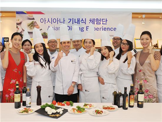 아시아나항공이 24일 인천공항 지원단지내 LSG 스카이셰프(아시아나항공 기내식 지원)에서 기내식 체험행사를 실시했다. 이날 행사를 마치고 참가자들이 기념촬영을 하고 있다.