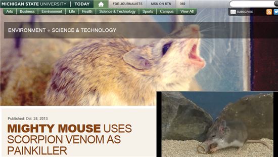▲전갈 이기는 무통증 생쥐(출처: 미국 미시건 주립대학교 홈페이지)