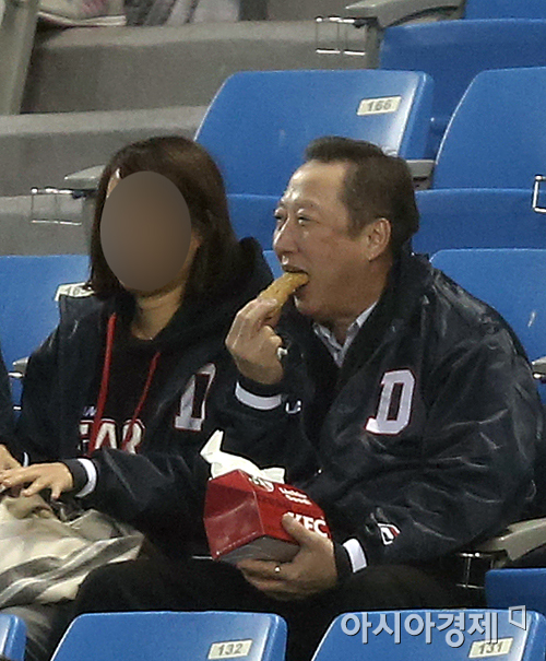 [아시아경제 정재훈 기자] 두산 박용만 회장이 28일 오후 두산 베어스와 삼성 라이온즈의 2013 한국야쿠르트 세븐 프로야구 한국 시리즈 4차전 경기가 열릴 예정인 서울 잠실 야구장을 찾아 경기 시작을 기다리며 치킨을 먹고 있다.정재훈 기자 roze@asiae.co.kr<ⓒ세계를 보는 창 경제를 보는 눈, 아시아경제(www.asiae.co.kr) 무단전재 배포금지>