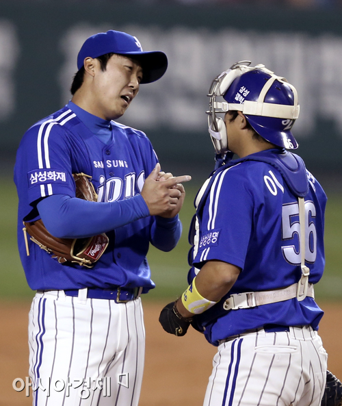 [아시아경제 정재훈 기자] 28일 오후 서울 잠실야구장에서 열린 두산 베어스와 삼성 라이온즈의 2013 한국야쿠르트 세븐 프로야구 한국 시리즈 4차전. 삼성 배영수가 1회말 1사 1루 상황 김현수에게 볼넷을 내주고 포수 이지영과 대화를 나누고 있다.정재훈 기자 roze@asiae.co.kr<ⓒ세계를 보는 창 경제를 보는 눈, 아시아경제(www.asiae.co.kr) 무단전재 배포금지>