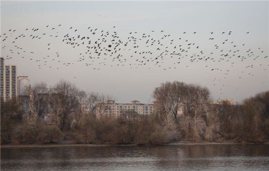 밤섬은 11월 하순이 되면 철새들의 낙원으로 변한다. 물오리와 왜가리, 가마우지 등 각종 새들이 겨울을 나는 보금자리로 이용한다. 사진에서는 가마우지떼가 밤섬 하늘을 날고 있다.