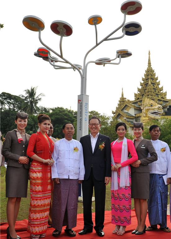 [아시아경제 황준호 기자] 아시아나항공은 31일 미얀마 양곤의 쉐다곤 파고다에서 열린 아시아나 친환경 태양광 가로등 업무협약 체결 및 기증 행사를 가졌다. 이날 기증 행사 후 윤영두 아시아나항공 사장이 관계자들과 기념촬영을 하고 있다. (사진에서 왼쪽 네번째가 윤영두 아시아나항공 사장이며 윤 사장 왼쪽 옆이 뮌 스웨(Myint Swe) 양곤주 주지사, 오른쪽 끝이 뮌 떼인(Myint Thein) 양곤주 사회부 장관이다.)황준호 기자 rephwang@asiae.co.kr<ⓒ세계를 보는 창 경제를 보는 눈, 아시아경제(www.asiae.co.kr) 무단전재 배포금지>