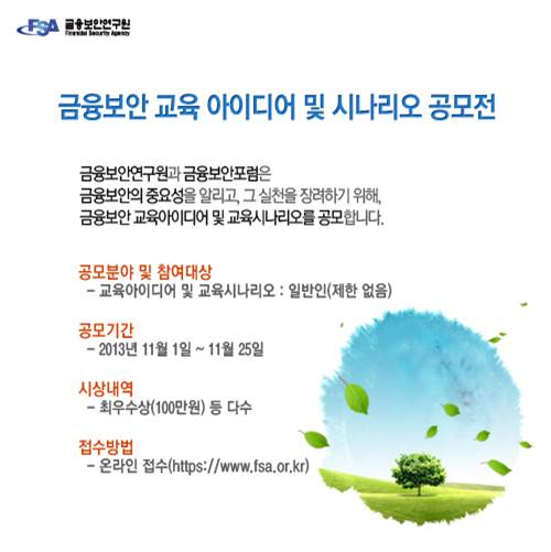 [아시아경제 김철현 기자] 금융보안연구원은 금융보안포럼과 공동으로 '금융보안 교육 아이디어 및 시나리오 공모전'을 개최한다고 31일 밝혔다.이번 공모는 교육 아이디어, 교육 시나리오 2개 부문으로 나눠 진행되며 별도 참가 자격 없이 누구나 응모가 가능하다.아이디어 부문은 금융보안 교육 시행의 모범 사례나 발전적 모델에 대한 내용을, 시나리오 부문은 대상별 교육 내용 구성안을 제출하면 된다. 최우수상에 100만원의 상금이 수여된다.접수 기간은 11월1일부터 11월25일까지며 자세한 내용은 금융보안연구원 홈페이지(www.fsa.or.kr)에서 확인할 수 있다.금융보안연구원 관계자는 "이번 공모전이 금융보안 교육에 대한 인식 확산 및 교육발전 방안 모색에 도움이 될 것으로 기대한다"고 말했다.