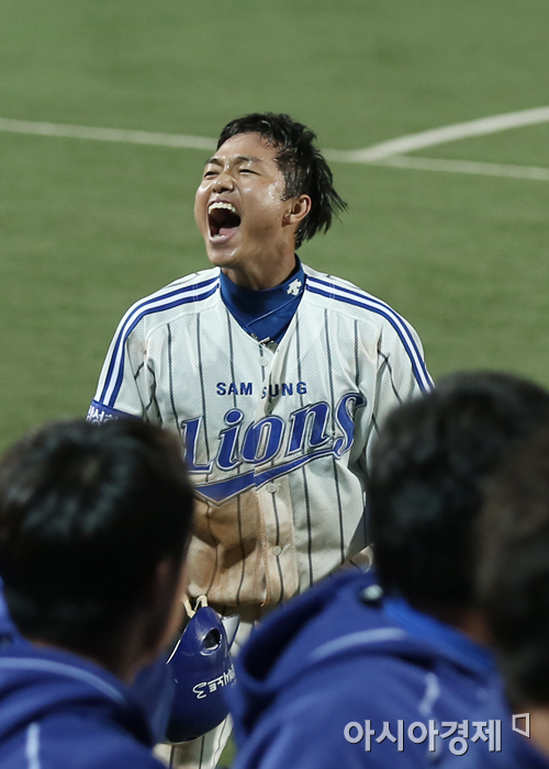 [대구=아시아경제 정재훈 기자] 1일 오후 대구시민야구장에서 열린 2013 한국야쿠르트 세븐 프로야구 삼성 라이온즈와 두산 베어스의 한국 시리즈 7차전. 6회말 1사 만루 상황 최형우의 3루수 땅볼 때 실책을 틈타 2, 3루 주자 정병곤, 박한이가 홈인했다. 정병곤이 포효하고 있다.정재훈 기자 roze@asiae.co.kr<ⓒ세계를 보는 창 경제를 보는 눈, 아시아경제(www.asiae.co.kr) 무단전재 배포금지>