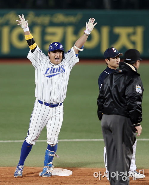 [대구=아시아경제 정재훈 기자] 1일 오후 대구시민야구장에서 열린 2013 한국야쿠르트 세븐 프로야구 삼성 라이온즈와 두산 베어스의 한국 시리즈 7차전. 6회말 1사 2, 3루 상황 박석민이 2타점 적시타를 치고 만세를 부르고 있다.정재훈 기자 roze@asiae.co.kr<ⓒ세계를 보는 창 경제를 보는 눈, 아시아경제(www.asiae.co.kr) 무단전재 배포금지>