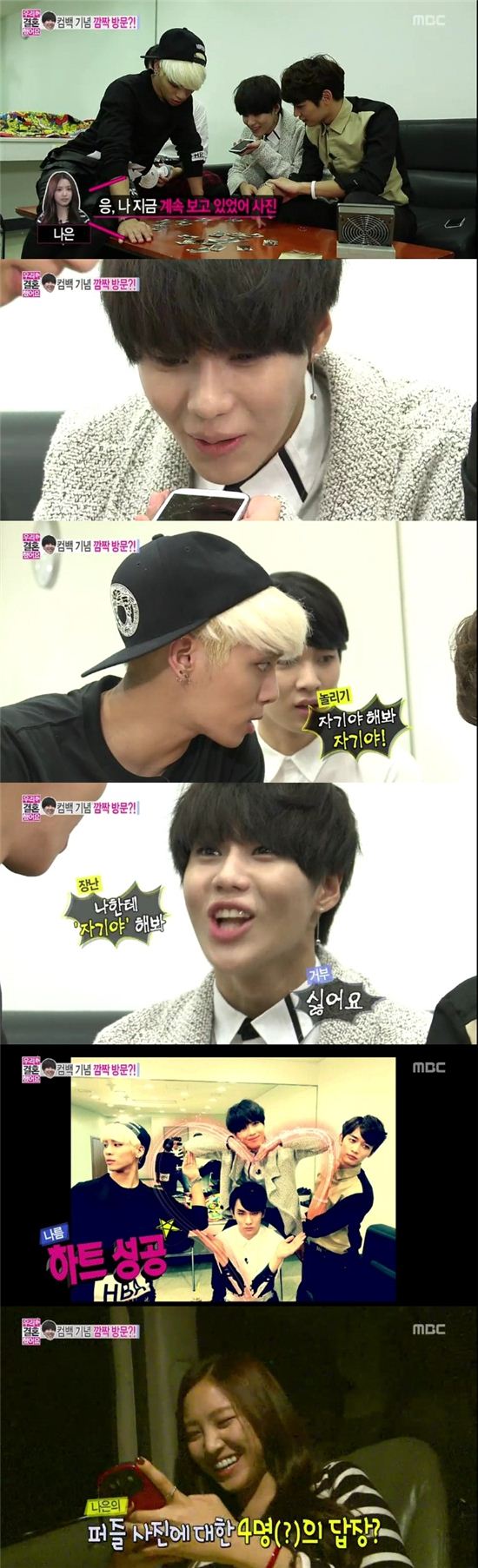 [아시아경제 유수경 기자]샤이니 멤버들이 태민의 가상아내 손나은의 편을 들어 눈길을 모았다.2일 오후 방송된 MBC '우리 결혼했어요 시즌4'(이하 '우결4')에서는 나은이 샤이니 컴백 기념 선물을 전달하는 모습이 그려졌다.이날 사진 퍼즐을 맞추며 헤매던 태민은 힌트를 달라고 나은에게 전화를 걸었다. 나은은 어려워하는 남편을 위해 완성된 퍼즐 사진 오른쪽 부분을 캡쳐해 보내줬다.하지만 태민이 전화를 끊자, 키는 "넌 '야'가 뭐냐?"며 나은을 좀 더 다정하게 불러주라고 말했다.종현 역시 "'자기야' 해봐라"며 부추겼고, 태민은 민망함에 버럭 화를 내며 "싫어. 내가 왜!"라고 소리를 질러 웃음을 자아냈다.결국 민호와 태민, 키 그리고 종현은 힌트를 알아차리고 다같이 하트를 만들어 나은에게 전송했다. 나은은 기쁜 마음을 감추지 못했다.유수경 기자 uu84@asiae.co.kr<ⓒ세계를 보는 창 경제를 보는 눈, 아시아경제(www.asiae.co.kr) 무단전재 배포금지>