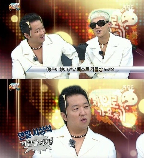 [아시아경제 장영준 기자]'무한도전' 가요제의 형용돈죵 팀이 커플상 욕심을 드러냈다.지난 2일 방송된 MBC '무한도전-자유로 가요제'에서는 형용돈죵 팀이 커플상을 받고 싶다는 욕심을 드러냈다. 지드래곤은 "명수 형과는 달리 형돈이 형은 편하다"면서 "그런데 형돈이 형이 연말 시상식에서 베스트 커플상을 노린다"고 폭로했다.이에 징형돈이 "넌 (시상식) 안 올거야?"라고 물었고, 지드래곤은 "상 타면 간다"라고 말해 눈길을 끌었다.형용돈죵 커플상 욕심을 접한 누리꾼들은 "형용돈죵 커플상 욕심, 정말 후보에 오른다면 일단 난 한 표" "형용돈죵 커플상 욕심, 지드래곤도 굉장히 받고 싶은 모양" "형용돈죵 커플상 욕심, 정말 두 사람이 탔으면 좋겠다" 등의 반응을 보였다.장영준 기자 star1@asiae.co.kr<ⓒ세계를 보는 창 경제를 보는 눈, 아시아경제(www.asiae.co.kr) 무단전재 배포금지>