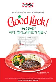 [아시아경제 오주연 기자]TGI프라이데이스는 수험표를 제시하고 매장을 찾은 고객에게 스테이크를 무료로 제공한다고 4일 밝혔다.이번 행사에서 TGI프라이데이스는 2만원 이상 주문한 고객 중 수학능력시험 수험표를 제시한 고객에게 TGI 프라이데이스의 인기 메뉴인 '잭다니엘 찹스테이크'를 무료로 제공한다.TGI프라이데이스 관계자는 “대학 진학을 위해 수능 시험에 매진한 수험생들을 응원하고 좋은 결과를 바라는 마음에 기획했다”고 전했다.오주연 기자 moon170@asiae.co.kr<ⓒ세계를 보는 창 경제를 보는 눈, 아시아경제(www.asiae.co.kr) 무단전재 배포금지>