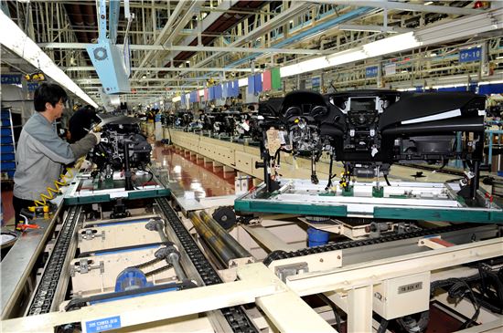 현대모비스 아산공장 운전석모듈 생산라인에서 공장직원들이 작업하고 있다.