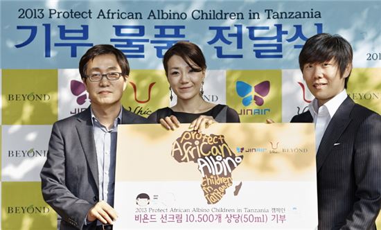 LG생활건강의 화장품 브랜드 비욘드와 저비용항공사 진에어는 5일 서울 삼성동 후원카페 '유익한 공간'에서 아프리카 알비노 어린이 환자를 돕기 위해 자외선차단제를 국제아동돕기연합(UHIC)에 전달하는 행사를 개최했다. 행사에 참석한 조현민 진에어 전무(가운데)와 이만희 LG생활건강 부문장(왼쪽) 등은 전달식 후 기념촬영을 하고 있다.