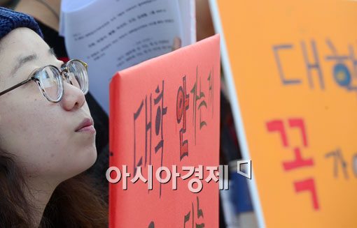 [아시아경제 백소아 기자] 2014학년도 대학수학능력시험이 치러진 7일 서울 청계광장에서 열린 2013 대학입시거부선언 발표 기자회견에서 '대학입시거부로 삶을 바꾸는 투명가방끈들의 모임'회원들이 손팻말을 들고 있다.백소아 기자 sharp2046@asiae.co.kr<ⓒ세계를 보는 창 경제를 보는 눈, 아시아경제(www.asiae.co.kr) 무단전재 배포금지>