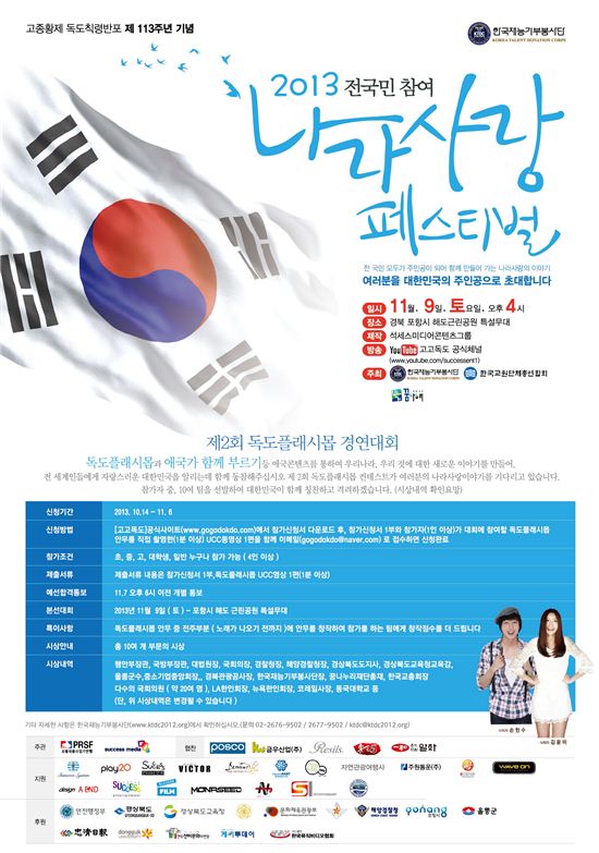 [아시아경제 e뉴스팀]‘2013나라사랑페스티벌’이 개최된다.2012년 2월 서울역광장을 시작으로 현재 전국 각지 및 해외에서 약 50만 명이 넘는 불특정 다수의 국민들과 특히 청소년들이 주인공이 되어 진행돼오던 '고고독도' 독도플래시몹이 11월 9일 토요일 오후4시 경북 포항소재 해도근린공원에서 한국교원단체총연합회(회장 안양옥)와 한국재능기부봉사단(단장 석성원), 4050꿈나누리(공동대표 이행숙)의 주최와 충청일보 주관으로 ‘2013나라사랑페스티벌’을 개최한다.이 행사에는 이미 전국 각지에서 독도플래시몹 퍼포먼스에 참여했던 많은 국민들, 특히 어린 청소년들이 사전예선을 통하여 당일 특설무대에 총 15개 전국 참여팀들의 나라사랑퍼포먼스를 통한 독도사랑이야기가 펼쳐지는 독도플래시몹경연대회를 비롯하여 김관용 경상북도도지사의 선창으로 ‘독도의 선서’, ‘독도는 우리 땅!’ 선포식 등이 진행된다.또, 당일 현장에서는 전체 참가자 및 관계자를 비롯한 방문객 포함 약 5,000여 명이 함께 독도플래시몹 및 애국가 함께 부르기 퍼포먼스를 진행한다. e뉴스팀 ent@asiae.co.kr<ⓒ세계를 보는 창 경제를 보는 눈, 아시아경제(www.asiae.co.kr) 무단전재 배포금지>