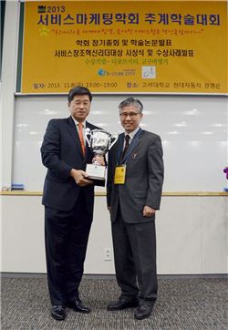 김경원 디큐브시티 대표(왼쪽)와 김정구 서비스마케팅학회 회장이 시상 직후 기념 촬영을 하고 있다.<br />