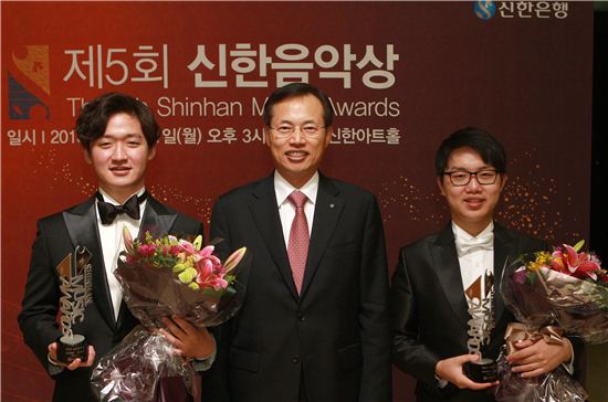 11일 신한아트홀에서 열린 제5회 신한음악상 시상식에서 성악부문 수상자 백승훈군(좌측)과 바이올린부문 수상자 고동휘군(우측)이 이원호 신한은행 부행장과 함께 기념촬영을 하고 있다.