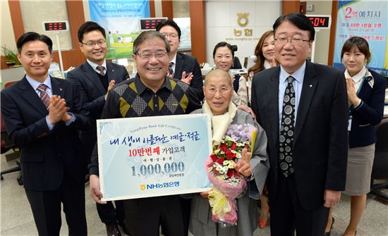 12일 농협은행이 '내 생애 아름다운 정기 예ㆍ적금' 10만 번째 고객(앞줄 오른쪽에서 두 번째)에게 100만원 여행상품권을 전달하고 있다.