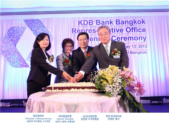 [아시아경제 김은별 기자] KDB산업은행은 13일 방콕사무소를 열고 한국계 은행 중 유일하게 태국에 진출했다. 김한철 산업은행 수석부행장(오른쪽 두번째)과 살리니 왕딴 태국중앙은행 부총재보(왼쪽 두번째), 필라락 유카셈윙 태국재무부 수석국장(왼쪽 첫번째), 전재만 주태 한국대사관 대사(오른쪽 첫번째) 등이 방콕사무소 개소식 후 기념촬영을 하고 있다. 김은별 기자 silverstar@asiae.co.kr<ⓒ세계를 보는 창 경제를 보는 눈, 아시아경제(www.asiae.co.kr) 무단전재 배포금지>