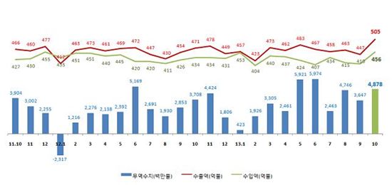 최근 2년(2011년 10월~2013년 10월) 수출액, 수입액, 무역수지 흐름 비교 그래프