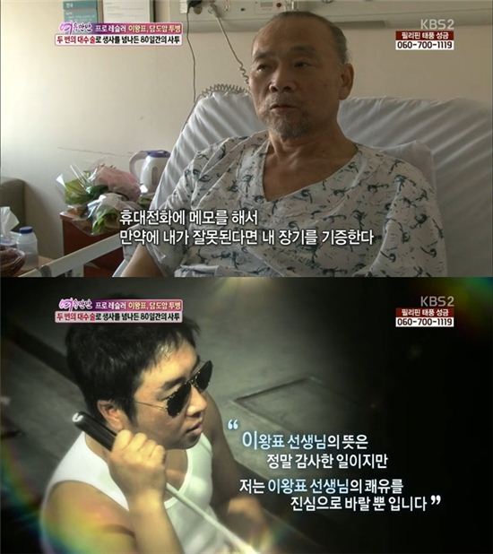 [아시아경제 e뉴스팀]전직 프로레슬러 이왕표가 개그맨 이동우에게 자신의 눈을 기증한다는 뜻을 밝혔다.15일 방송된 KBS2 '여유만만'에서는 이왕표의 근황이 공개됐다. 이왕표는 담도암 투병으로 벌써 두 번의 대수술을 받았고, 그간 생사를 넘나드는 사투를 벌여왔다.이왕표는 "수술 자체가 위험하고 죽을 확률도 있다고 하니 최후를 생각하게 됐다. 수술 들어가면서 '만약에 내가 잘못된다면 내 장기를 기증한다. 눈은 이동우 씨에게 줬으면 좋겠다'고 문자를 남겼다"고 말하며 자신의 휴대 전화 속 유서를 공개했다.이동우는 2003년 희귀병인 망막색소변성증 판정을 받고 시력을 잃었다. 이왕표의 이야기를 전해들은 이동우는 제작진을 통해 "이왕표 선생님의 뜻은 정말 감사한 일이지만 저는 이왕표 선생님의 쾌유를 진심으로 바랄 뿐입니다"라며 감사의 뜻을 전했다.한편 이동우는 시각장애인이 된 뒤에도 철인 3종 경기, 재즈 가수 도전 등 왕성한 활동을 이어가고 있다.e뉴스팀 ent@asiae.co.kr<ⓒ세계를 보는 창 경제를 보는 눈, 아시아경제(www.asiae.co.kr) 무단전재 배포금지>