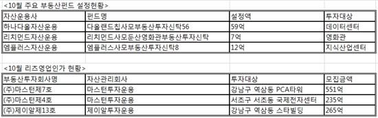 실제로 지난달 신규 설정된 부동산펀드와 리츠는 모두 사모형태인데다 투자대상도 다양하다. 칸서스자산운용이 용산구 동자동 센트레빌 아스테리움 오피스동을 3616억원에 매입하는 '칸서스동자동사모부동산투자신탁'을 설정했고, 엠플러스자산운용은 용인시 기흥구에 위치한 지식산업센터 '흥덕IT밸리'의 일부를 매입하는 '엠플러스사모부동산투자시탁 8호'를 12억원에 설정했다. 리치먼드자산운용은 둔산의 영화관에 투자하는 '리치먼드사모둔산영화관부동산투자신탁'을 설정액 7억원으로 매입했다. 리츠에선 마스턴투자운용이 강남구 역삼동 PCA타워 위탁관리리츠를 설립하면서 공모로 551억원, 사모로 556억원을 각각 모집했다. 삼성증권이 투자확약서를 제출하고 연 평균 예상수익률을 6%로 강남 투자자들을 모으는데 성공한 것이 주효했다. 역삼동 PCA타워 매입에 이어 마스터운용은 서초구 서초동 국제전자센터를 일부 매입하기 위해 235억원을 모집하고 있다. 제이알투자운용 역시 강남구 역삼동 스타빌딩을 265억원에 매입할 예정이다. 김규정 우리투자증권 100세시대 연구소 전문위원은 "저금리 기조가 장기화되면서 기업 뿐만 아니라 슈퍼리치들도 예금 위주의 자산운용 포트폴리오에서 대안투자 비중을 점점 높이고 있다"면서 "대한투자 역시 부동산 실물에 직접 투자하는데 대한 리스크가 갈수록 커지고 있어 시세 차익 보다는 임대 수익을 선호하는 경향 강화로 부동산펀드나 리츠 같은 간접투자상품에 관심이 높다"고 설명했다.진희정 기자 hj_jin@asiae.co.kr<ⓒ세계를 보는 창 경제를 보는 눈, 아시아경제(www.asiae.co.kr) 무단전재 배포금지>