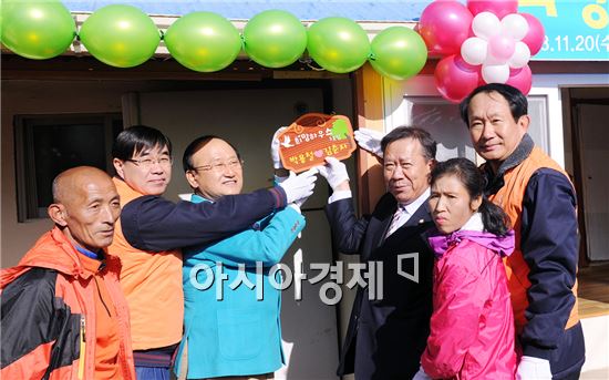 "여수시·한화케미칼·한화에너지 등 동참해 주거환경개선사업"[아시아경제 노해섭 기자]여수 지역 소외계층의 보금자리 ‘희망하우스 3호’가 탄생했다. 시에 따르면 20일 오전 여수시 봉계동 봉강마을에서 김충석 여수시장과 한화케미칼 김평득 공장장, 한화에너지 류적용 공장장 등 50여명이 참석한 가운데 ‘희망하우스 3호’ 현판식을 가졌다.희망하우스 3호는 한화케미칼, 한화에너지, Lee가구 갤러리, 전남사회복지공동모금회 등 각계의 후원을 통해 건립됐다. 그동안 비만 오면 주택 외벽이 침수되고 연탄보일러마저 고장 나 있는 열악한 환경에서 생활하던 수혜자 박 모 씨의 가족은 이날 새 집을 선물 받은 기쁨을 감추지 못했다. 김충석 여수시장은 이 자리에서 “불편한 몸으로 어렵게 생활하고 있는 가정을 위해 지역기업과 자원봉사자들이 집수리에 직접 참여해 희망하우스 3호가 탄생됐다”면서 “덕분에 50년 이상 이 마을에 거주해 온 박 씨 가족이 일생에서 가장 따뜻한 겨울을 보낼 수 있게 됐다”며 감사를 표했다. 여수시 관계자는 “주거환경이 열악한 지역 저소득층 가정을 꾸준히 발굴해 집수리를 통한 릴레이 나눔 문화를 확산시켜 나가겠다”고 말했다.노해섭 기자 nogary@<ⓒ세계를 보는 창 경제를 보는 눈, 아시아경제(www.asiae.co.kr) 무단전재 배포금지>