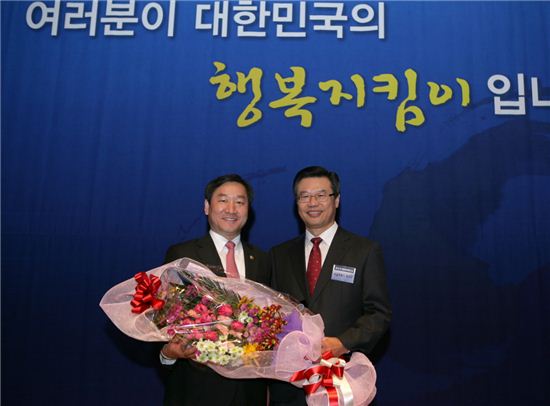 성장현 용산구청장(오른쪽)이 유정복 안전행정부장관으로부터 인증서를 받은 후 기념사진을 찍었다.