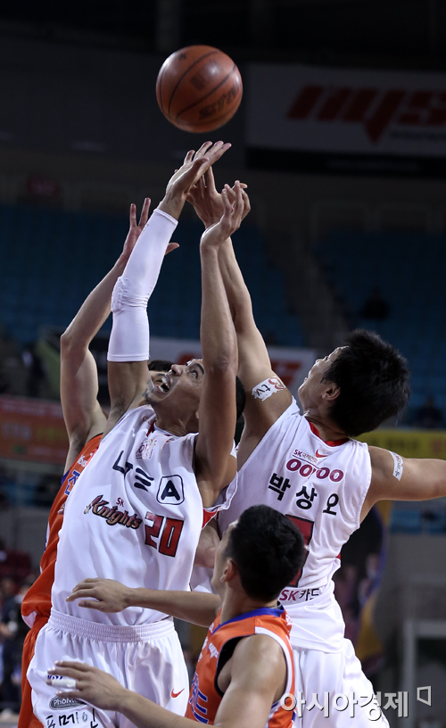 [인천=아시아경제 정재훈 기자] 22일 오후 인천 삼산월드체육관에서 열린 KB국민카드 2013~2014 프로농구 전자랜드와 SK의 경기. 양 팀 선수들이 공을 쫓아 점프하고 있다.정재훈 기자 roze@asiae.co.kr<ⓒ세계를 보는 창 경제를 보는 눈, 아시아경제(www.asiae.co.kr) 무단전재 배포금지>