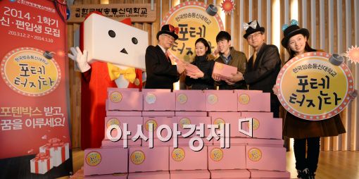 [아시아경제 최우창 기자]25일 서울 종로구 대학로 방송통신대학교 락앤락 카페에서 열린 2014년 1학기 신·편입생 모집 홍보 이벤트 '포텐 박스 받고, 꿈 이루세요'에서 조남철(왼쪽) 한국방송통신대학교 총장이 직장인, 마이스터고 학생들에게 전달할 포텐 박스를 들고 포즈를 취하고 있다. 최우창 기자 smicer@asiae.co.kr<ⓒ세계를 보는 창 경제를 보는 눈, 아시아경제(www.asiae.co.kr) 무단전재 배포금지>