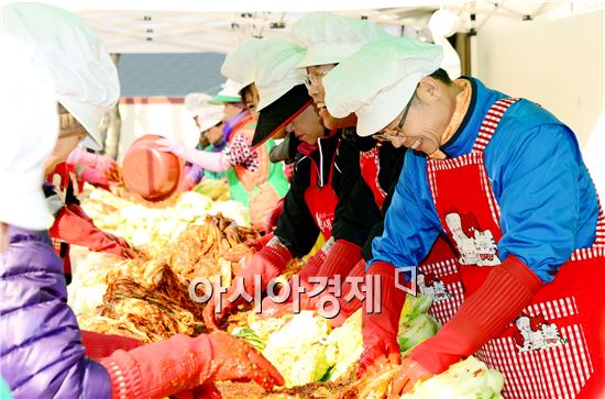 [아시아경제 노해섭 기자]광주 광산구 평동 사회단체들이 대대적으로 모여 ‘행복나눔!사랑의 김장김치 행사’를 열어 화제다. 민관 복지연대망 ‘투게더광산’ 평동위원회, 새마을협의회, 새마을부녀회, 평동사회단체장협의회, 통장단 200여 명이 함께 지난 23일 평동주민센터에서 어려운 이웃을 위해 사랑의 김장김치 담근 것.이날 담근 700포기의 김장김치는 평동 내 18개 경로당, 지역아동센터, 홀몸어르신 가정 등에 배달됐다.이날 김치를 함께 담근 민형배 광산구청장은 “사랑의 김장김치가 어려운 이웃들이 따뜻한 겨울을 보낼 수 있도록 도움이 됐으면 좋겠다”며 “광산구에 나눔문화가 더욱 꽃피도록 힘쓰겠다”고 말했다. 노해섭 기자 nogary@<ⓒ세계를 보는 창 경제를 보는 눈, 아시아경제(www.asiae.co.kr) 무단전재 배포금지>