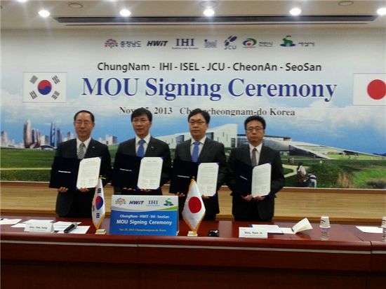 안희정(왼쪽에서 2번째) 충남도지사, 추한철 서산시 부시장, 우남제 현대위아 IHI 터보(주) 대표이사, 미츠나가 IHI사 부사장 등이 투자유치협정을 맺고 협약서를 펼쳐보이고 있다.