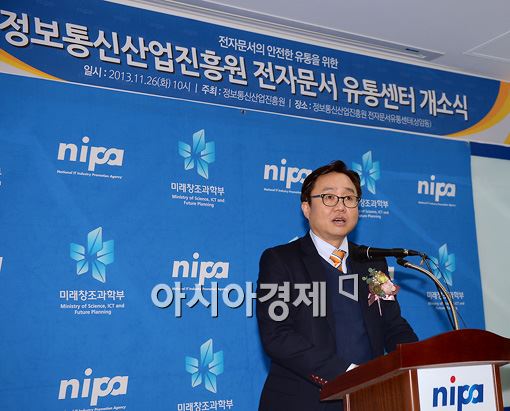 [아시아경제 송재원 기자] 정보통신산업진흥원 박수용 원장이 26일 오전 서울 마포구 상암동 누리꿈스퀘어 연구개발센터에서 열린 정보통신산업진흥원 전자문서 유통센터 개소식에 참석해 인사말을 하고 있다.샵메일은 기업과 개인 등이 전자문서를 안전하게 송수신하고 법적 효력을 보장 받을 수 있도록 공인전자주소 기반의 전자 문서 유통서비스로 최근 보이스피싱을 주제로 한 개그로 인기를 얻고 있는 개그콘서트 황해코너와 잘 어울려 코너의 주인공인 이수지, 정찬민을 홍보대사로 위촉했다.송재원 기자 sunny@asiae.co.kr<ⓒ세계를 보는 창 경제를 보는 눈, 아시아경제(www.asiae.co.kr) 무단전재 배포금지>