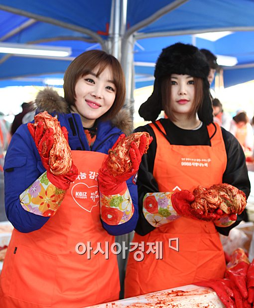 [아시아경제 정준영 기자] 걸 그룹 브라운아이드걸스 나르샤, 미료가 26일 오전 서울 영등포구 여의도동 중소기업 중앙회 문화마당에서 열린 '2013 행복나눔 김치 담그기' 행사에 참석해 포즈를 취하고 있다.정준영 기자 jjy@<ⓒ세계를 보는 창 경제를 보는 눈, 아시아경제(www.asiae.co.kr) 무단전재 배포금지>