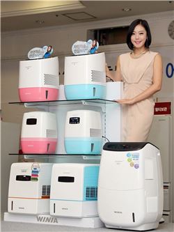 ▲위니아만도 모델이 한국공기청정협회으로부터 'CA(클린에어)마크'를 획득한 에어워셔 제품을 소개하고 있다.