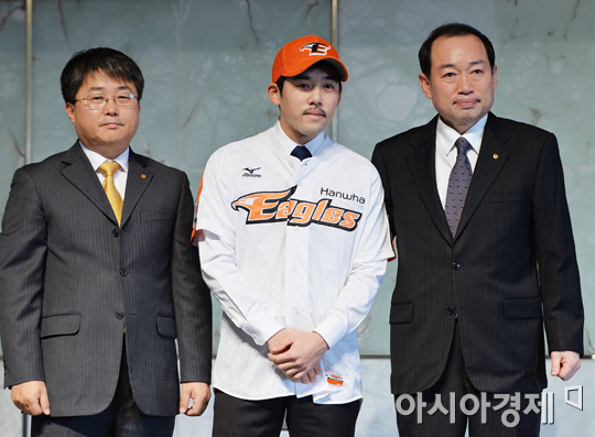 [아시아경제 정재훈 기자] FA 이적으로 한화 이글스에 새 둥지를 튼 정근우와 이용규가 27일 오후 서울 플라자호텔에서 공식 입단식을 가졌다. 이용규가 노재덕 단장, 정승진 대표이사와 기념촬영을 하고 있다.정재훈 기자 roze@asiae.co.kr<ⓒ세계를 보는 창 경제를 보는 눈, 아시아경제(www.asiae.co.kr) 무단전재 배포금지>