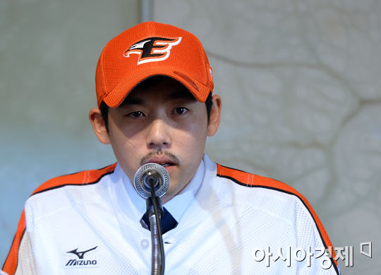 [아시아경제 정재훈 기자] FA 이적으로 한화 이글스에 새 둥지를 튼 정근우와 이용규가 27일 오후 서울 플라자호텔에서 공식 입단식을 가졌다. 이용규가 각오를 밝히고 있다.정재훈 기자 roze@asiae.co.kr<ⓒ세계를 보는 창 경제를 보는 눈, 아시아경제(www.asiae.co.kr) 무단전재 배포금지>