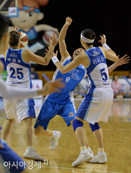 [용인=아시아경제 정재훈 기자] 28일 오후 용인실내체육관에서 열린 우리은행 2013-2014 여자프로농구 삼성생명과 우리은행의 경기. 우리은행 박혜진이 삼성생명 선수들에게 파울을 당하고 있다.정재훈 기자 roze@asiae.co.kr<ⓒ세계를 보는 창 경제를 보는 눈, 아시아경제(www.asiae.co.kr) 무단전재 배포금지>