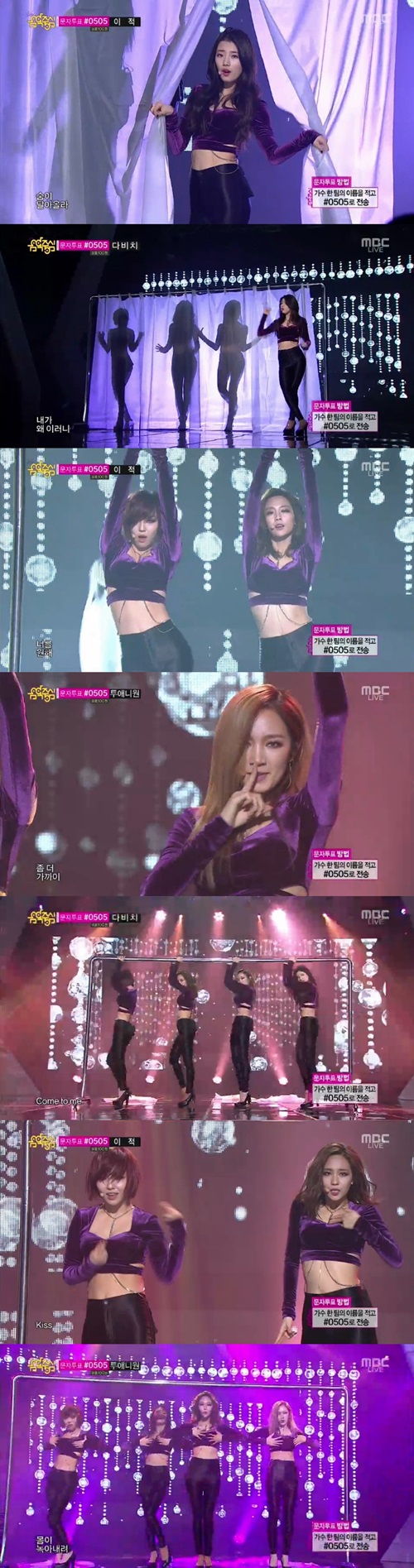 [아시아경제 유수경 기자]걸그룹 미쓰에이가 물오른 섹시미로 눈 뗄 수 없는 무대를 선사했다.미쓰에이는 30일 오후 방송된 MBC '쇼! 음악중심'에 출연해 두 번째 정규앨범 타이틀 곡 '허쉬'를 열창했다.이날 미쓰에이 멤버들은 몸매 라인을 고스란히 드러내는 섹시한 의상을 입고 무대에 올랐다. 이들은 봉을 이용한 매력적인 춤사위로 강렬한 무대를 선보였다.'허쉬'는 기존 미쓰에이의 타이틀곡들과는 사뭇 다른 느낌의 독특한 어쿠스틱 분위기를 기반으로 후반으로 갈수록 다이내믹하고 다양해지는 전개가 인상적인 곡이다. 사랑하는 이와의 키스와 달콤한 속삭임, 그 짜릿한 떨림을 미쓰에이 특유의 공격적이며 진솔한 색채로 표현했다.한편 이날 '음악중심'에는 이적, 효린, 미쓰에이, FT아일랜드, 트러블메이커, 다비치, 노을, 산이, 빅스, 100% V, M.I.B, 테이스티, A-JAX, 신지훈, 히스토리, 윤한, Lush, 대국남아, 엠파이어 등이 출연해 화려한 무대를 꾸몄다.유수경 기자 uu84@asiae.co.kr<ⓒ세계를 보는 창 경제를 보는 눈, 아시아경제(www.asiae.co.kr) 무단전재 배포금지>