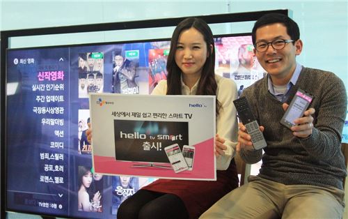 CJ헬로비전 직원들이 스마트폰으로 TV를 제어하는 '헬로tv 스마트'를 2일 홍보하고 있다. CJ헬로비전은 이날 스마트폰을 활용해 TV화면 원격 제어가 가능한 스마트 셋톱박스를 출시했다. 안드로이드 기반으로 게임을 비롯해 원격으로 방송을 녹화할 수 있는 '스마트 녹화(PVR)'기능 등 다양한 서비스를 누릴 수 있다.